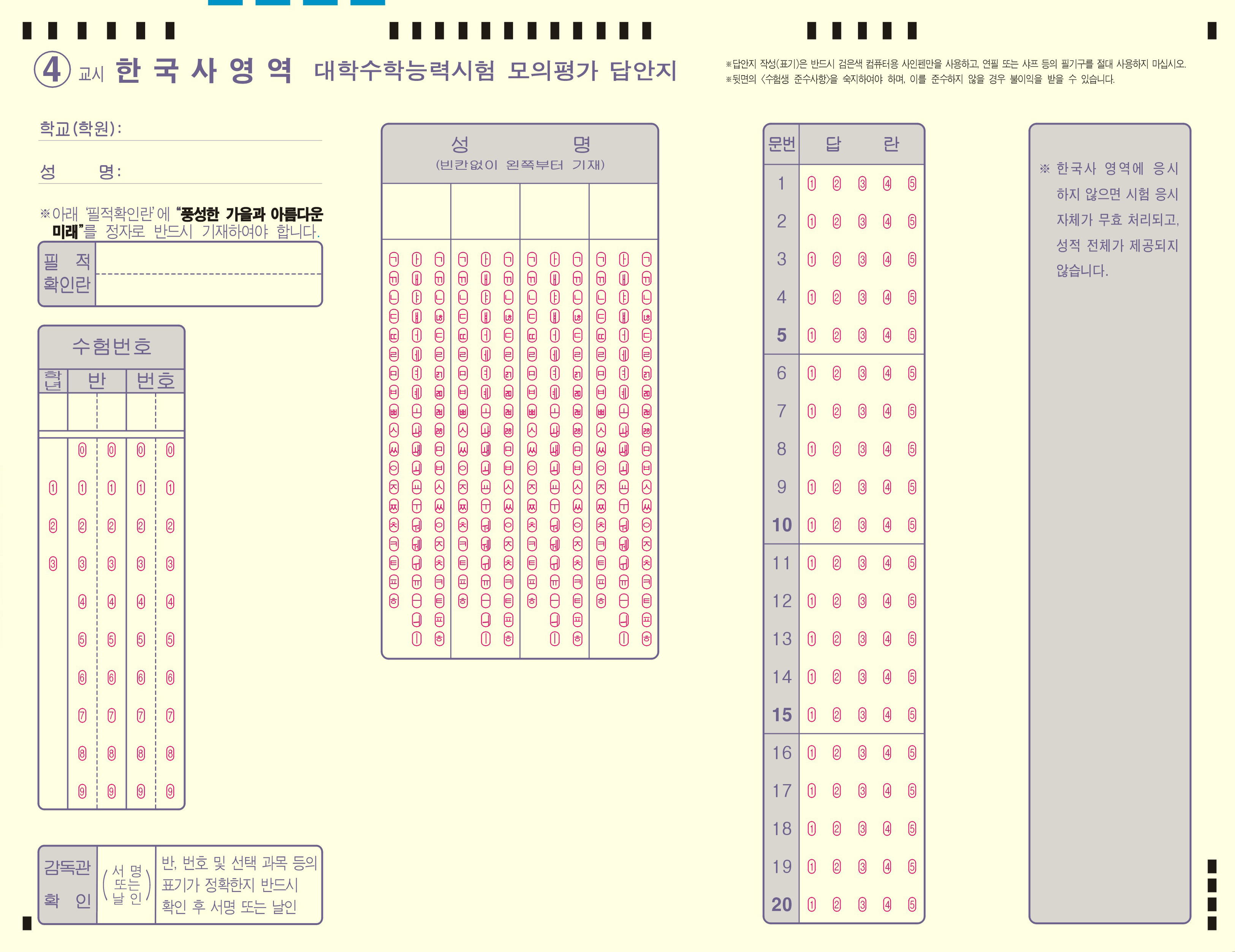 수능모의고사카드 OMR카드 한국사 영역